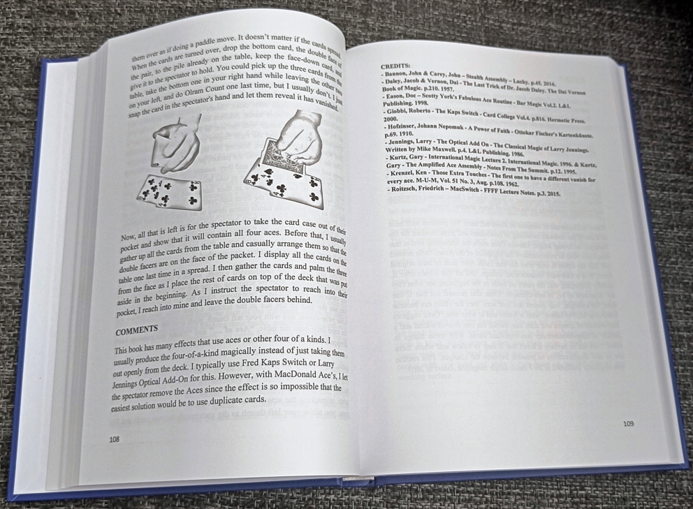 The project concludes with four essays/articles. First is an almost forgotten idea by Brother John Hamman on how to carry gaffed cards or packet tricks with you on a gig without those horrible-looking wallets and make it seem and feel like the cards came from a normal deck. Another essay focuses on my everyday carry. What do I have with me in social situations to be able to do really strong magic, without having to carry anything extra, or deck of cards, with me. This includes a tip on how to carry gaffed coins with you in a way that you don’t have to be afraid of buying a 50€ soda from a vending machine… The third article is a way to keep a larger repertoire of effects in your mind and make practicing them regularly easier. The book concludes with an article inspired by Roberto Giobbi’s essay on ”The Ten Greatest Card Effects.” Where I list my top 10, give my thoughts on these plots, and also point you towards where you could learn these.
