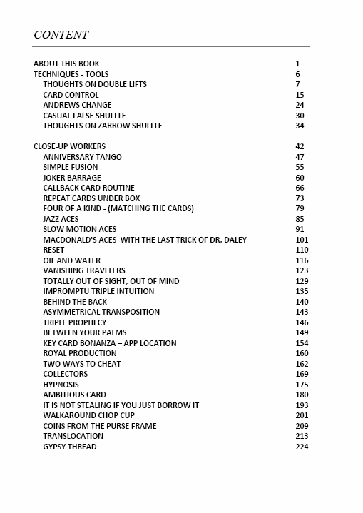 Seuraava luku koostuu materiaalista, jota olen käyttänyt, ja jota käytän ammattimaisessa repertuaarissani keikoilla yli kaksikymmentä vuotta. Pääpaino on pelikorteissa, mutta materiaalia on myös kolikoilla, nopilla, kupilla ja pallolla jne. Suuri osa korttimateriaalista voidaan tehdä sekoitetulla pakalla tai hyvin pienellä setupilla, joihin on yleensä helppo päästä kesken esiintymistilanteen. Tässä osiossa on paljon temppuja, joiden juuret ovat korttitaikuuden klassikoissa. Tästä kappaleesta et löydä uutta materiaalia IG reeleihin tai TikTokiin, mutta näillä rutiineilla on maksettu opinto-, asunto- ja autolaina reilussa kymmenessä vuodessa. Vaikka useiden rutiinien pohjana toimii taikuuden klassikoita, niin olen valmis laittamaan suuren osan näistä rinnakkain minkä tahansa vastaavan julkaistun rutiinin kanssa ja voin olla versioistani ylpeä. Alempana on kuva sisällysluettelosta.